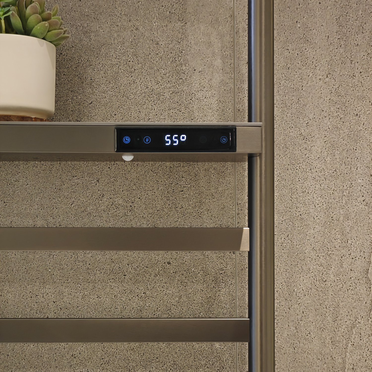 Elevate bathroom hygiene with this intelligent heated towel rack featuring advanced UV-C germicidal technology. Engineered with 280nm wavelength ultraviolet sterilization, the system eliminates 99.9% of bacteria, mold, and viruses while efficiently drying towels through optimized thermal convection. The integrated ceramic composite countertopwith natural stone finish provides water-resistant storage for toiletries and bath essentials. Featuring a space-efficient vertical design with IPX4 waterproof rating, this dual-function unit combines antimicrobial protection with organizational functionality for bathrooms ranging from compact powder rooms to master suites.