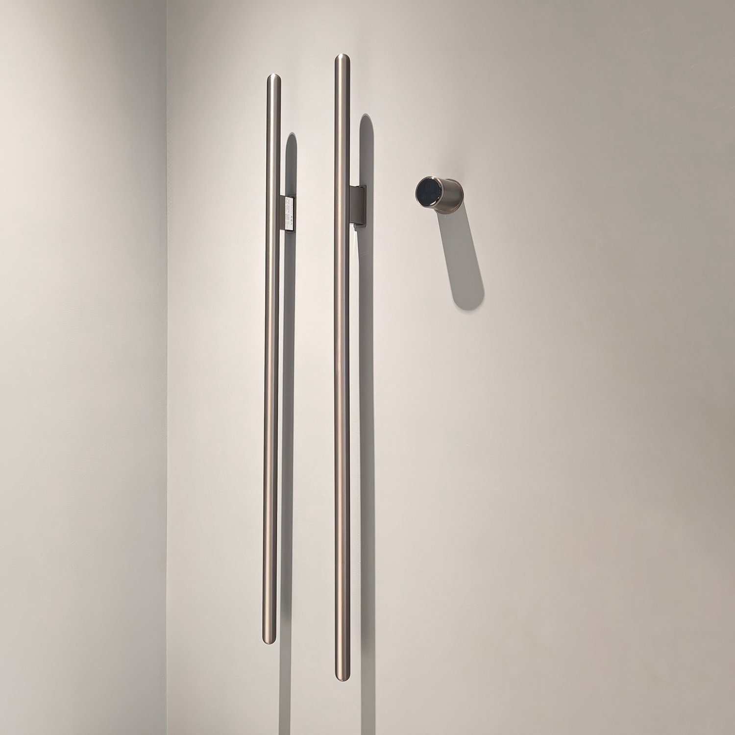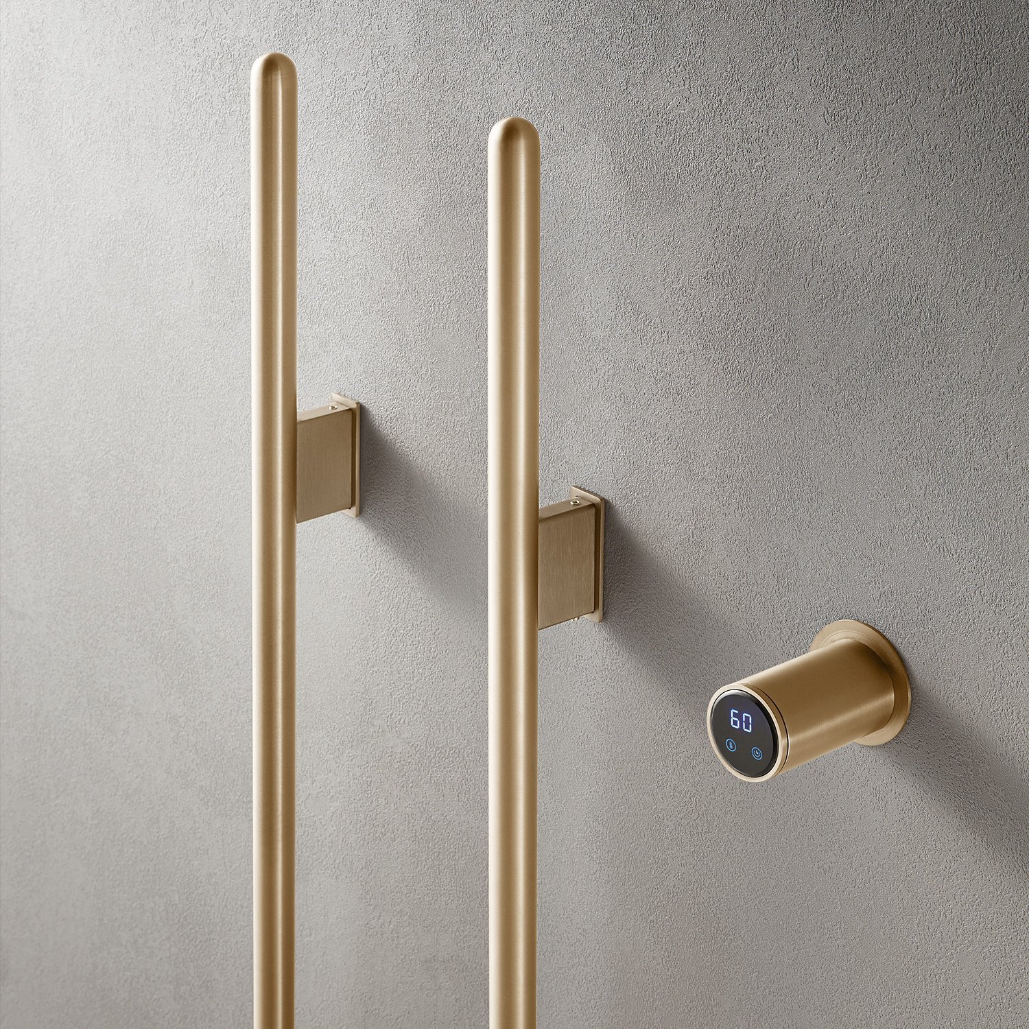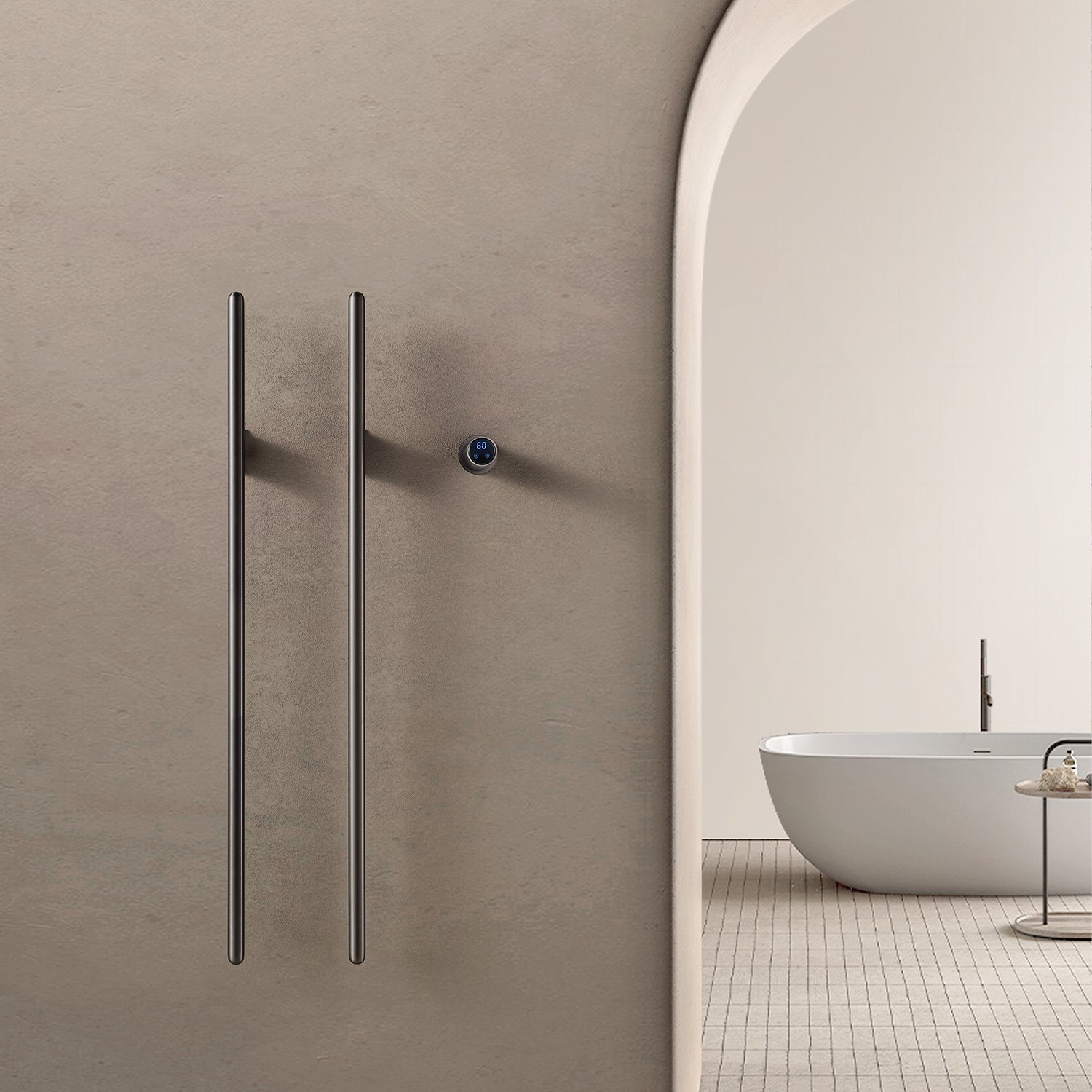 This heated towel rack features dual vertical rods, symbolizing “perfect pairing” (a homonym for “double happiness” in Chinese), which represents balance, harmony, and auspicious blessings. Designed for drying bath towels and robes, it is typically installed adjacent to bathtubs or shower enclosures. The installation requires pre-embedded wall-mounted components, while its minimalist design with distinctive geometric architecture delivers both functional performance and avant-garde aesthetic appeal.